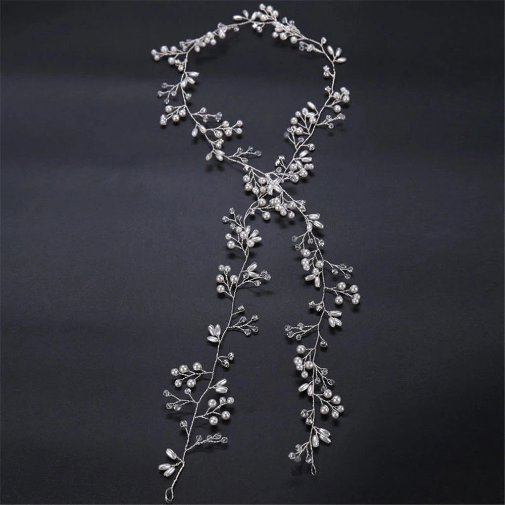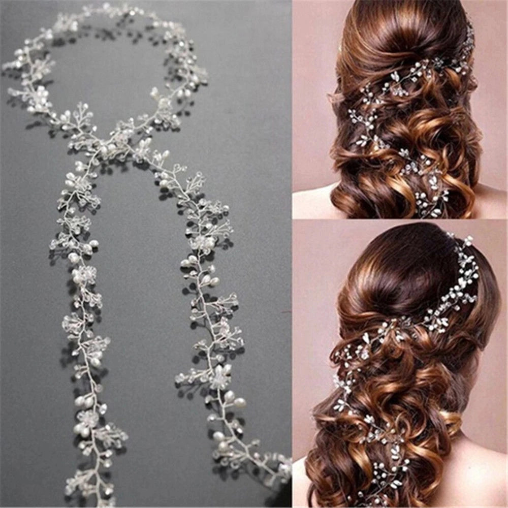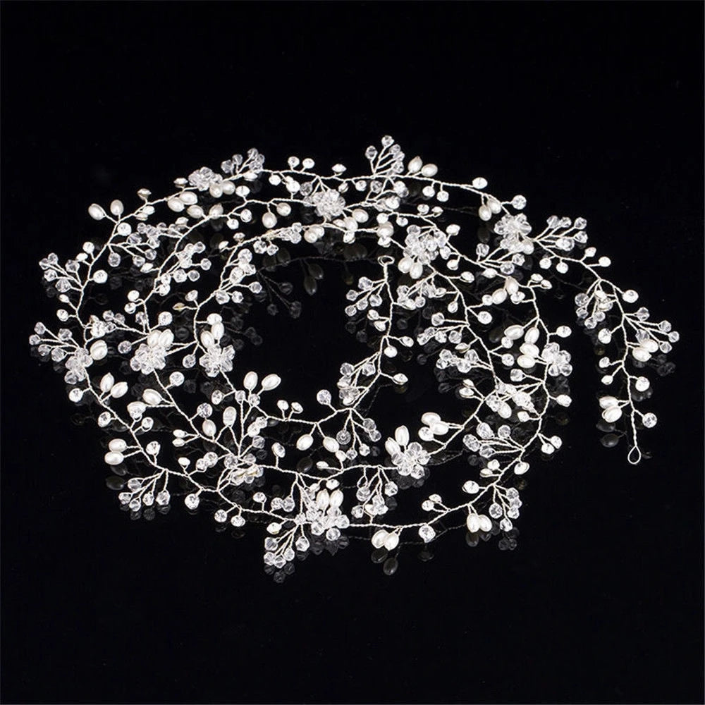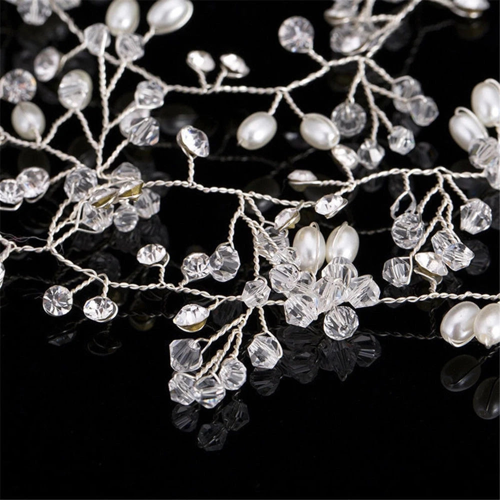 35CM Women Bridal Wedding Crystal Bride Hair Accessories Pearl Flower Headband Handmade Hairband Beads Decorative Hair Comb