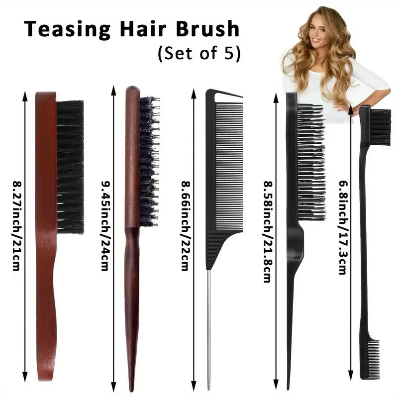 5pcs Boar Bristle Hair Brush Set with Edge Control - Slick Back, Teasing & Smoothing Combs for Men and Women