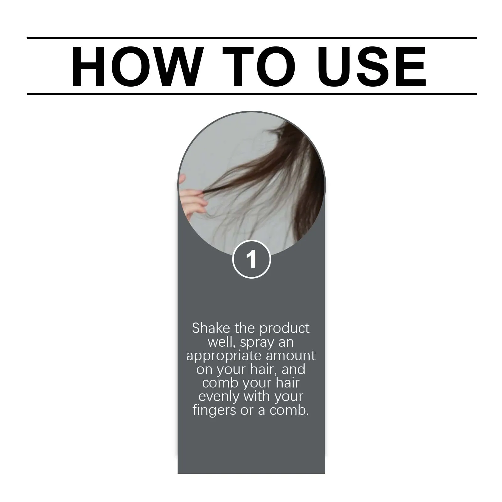 Usage:Shake the product well, spray an appropriate amount on your hair, and comb your hair evenly with your fingers or a comb.