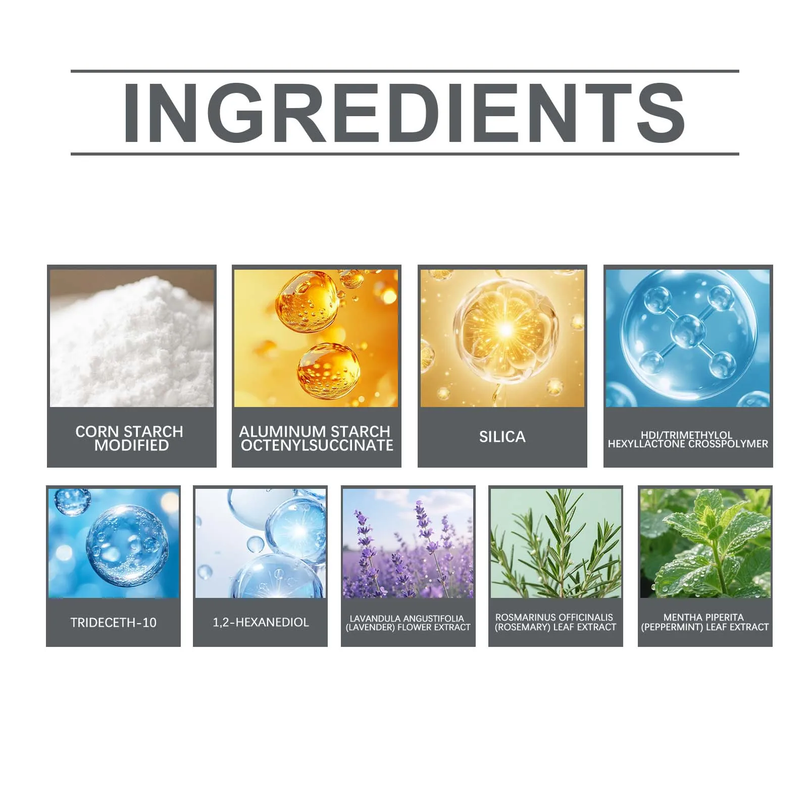 INGREDIENTS:CORN STARCH MODIFIED、ALUMINUM STARCH OCTENYLSUCCINATE、SILICA、HDI/TRIMETHYLOL HEXYLLACTONE CROSSPOLYMER、TRIDECETH-10、1,2-HEXANEDIOL、LAVANDULA ANGUSTIFOLIA (LAVENDER) FLOWER EXTRACT、ROSMARINUS OFFICINALIS (ROSEMARY) LEAF EXTRACT、MENTHA PIPERITA (PEPPERMINT) LEAF EXTRACT