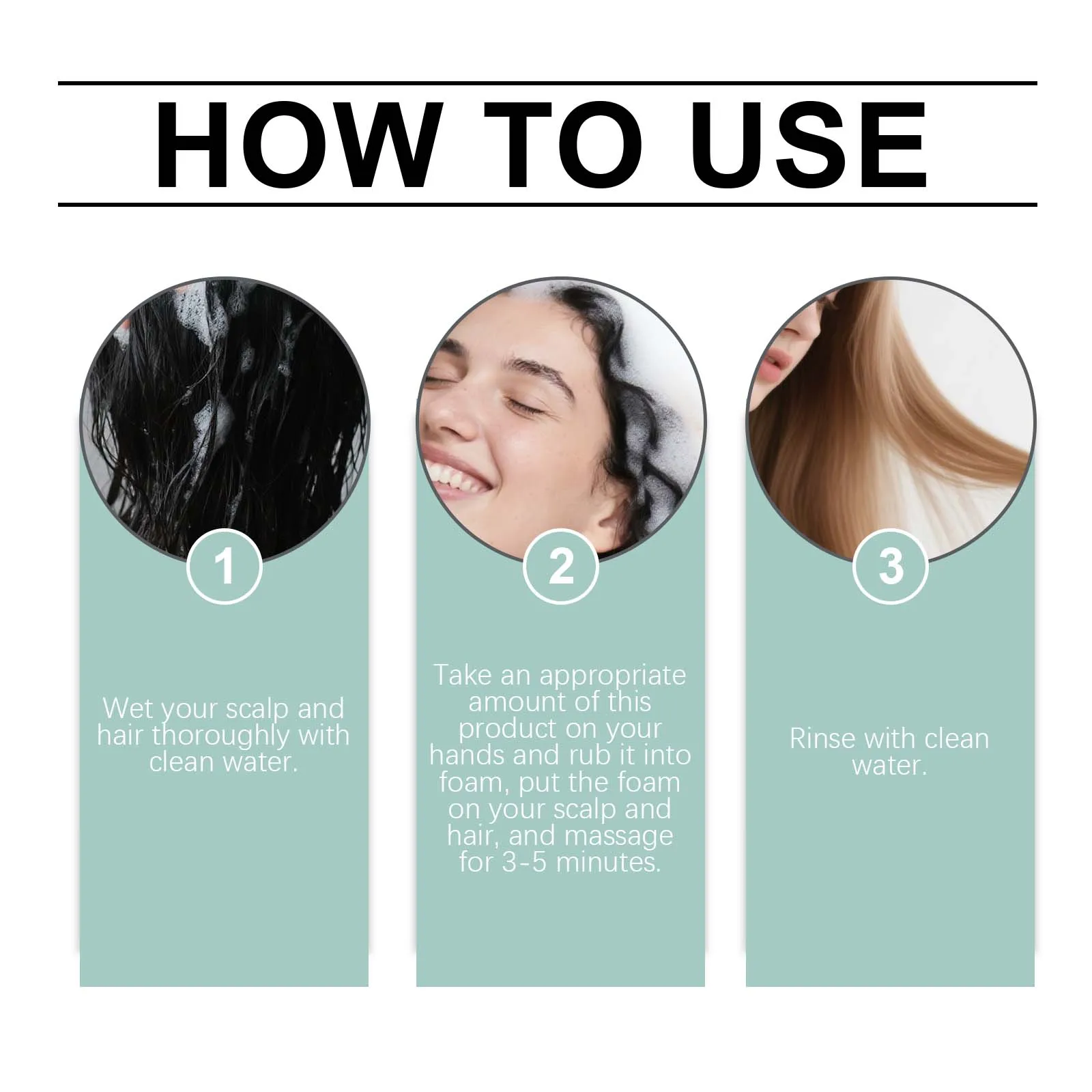 2.Take an appropriate amount of this product on your hands and rub it into foam, put the foam on your scalp and hair, and massage for 3-5 minutes.